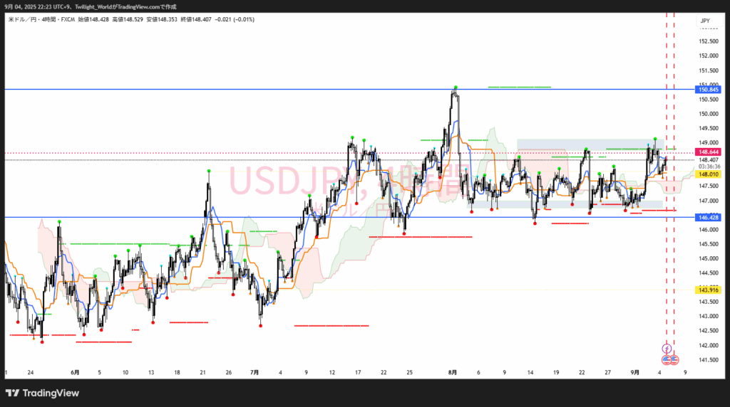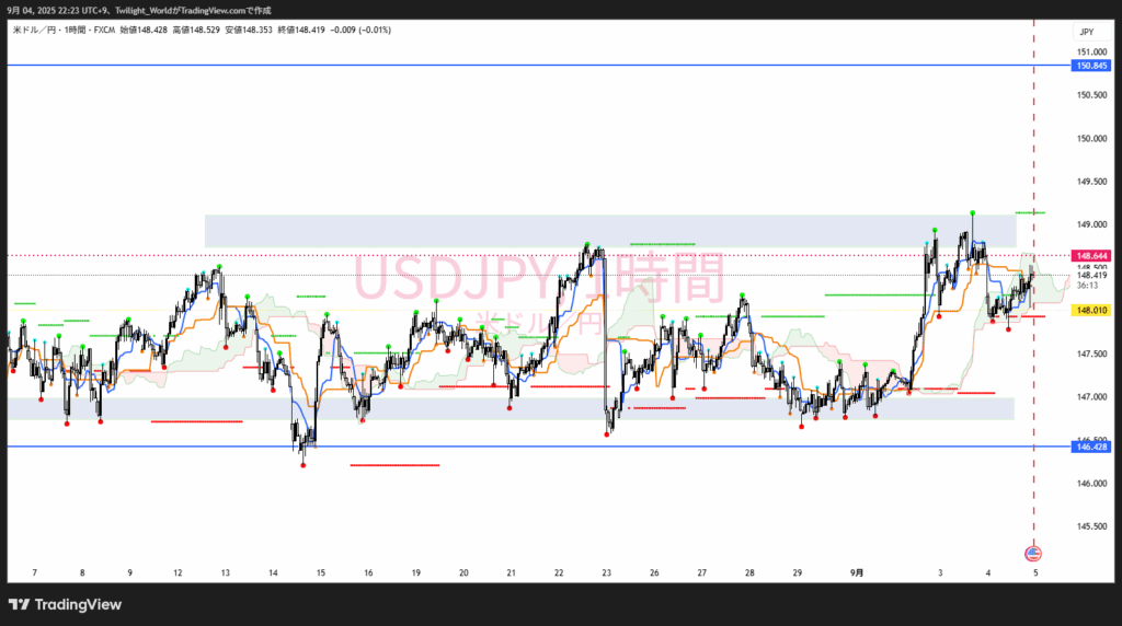 1時間足は、より短期的な動きを示しています。直近では9月に入ってから149円台に上昇する動きがありましたが、すぐに反落して現在は148円台前半で推移しています。これは日足や4時間足で確認したレンジの中の動きです。